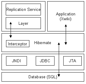 Отсюда видно, что приложение никак не связано с системой репликации. А система репликации связана с СУБД посредством библиотеки Layer, что позволяет заменить лишь её при использовании другой библиотеки ORM, нежели Hibernate. Replication Service представляет собой сервер репликатора (набор Java-сервлетов, обрабатывающих HTTP-запросы) и сервис, исполняющий активную роль (клиент, который инициирует соединение с сервером на другом узле).