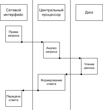 Рассмотрим процесс исполнения одиночного запроса типичным серверным приложением (см. рис. 1). Он состоит из пяти этапов: приема запроса (выполняется сетевым интерфейсом), анализа запроса (выполняется центральным процессором), считывания данных с диска (выполняется дисковым контроллером), создания ответа (выполняется центральным процессором) и передачи ответа. Разумеется, времена исполнения этих этапов могут различаться в зависимости от типа сервиса, предоставляемого сервером, и от самих запросов. Для сервера http, раздающего статические HTML страницы, время анализа запроса и форматирования ответа будет очень малым по сравнению с временами чтения с диска и передачи данных по сети. Напротив, у сервера приложений основная нагрузка ляжет на центральный процессор. Серверу баз данных может потребоваться несколько обращений к диску для того, чтобы найти все относящиеся к запросу данные, и т.д.. Тем не менее, давайте рассмотрим условный сервер, обрабатывающий однотипные запросы, у которых структура обработки запроса именно такова, как на рис. 1, а времена исполнения всех этапов одинаковы (последнее требование нужно лишь для того, чтобы мне было проще рисовать картинку).