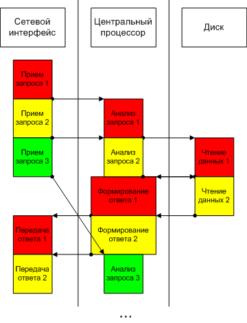 Видно, что сервер совмещает этапы исполнения перекрывающихся во времени запросов. Если относительные времена исполнения этапов запросов таковы, как на рис. 1 и 2, избежать взаимодействия запросов не удается, так что среднее время исполнения запроса может вырасти по сравнению с t. Но количество запросов, исполняемых в секунду, оказывается значительно больше, чем 1/t.